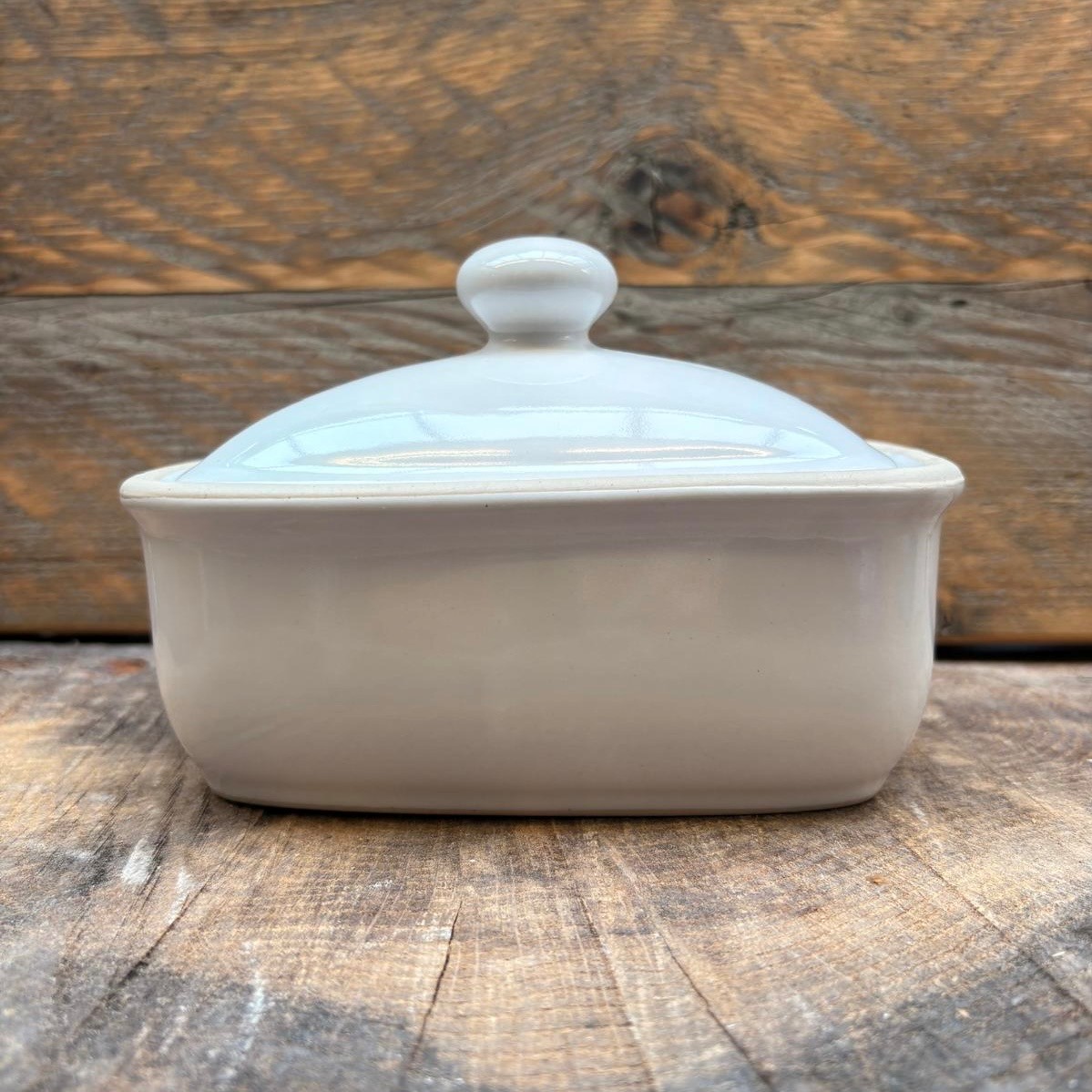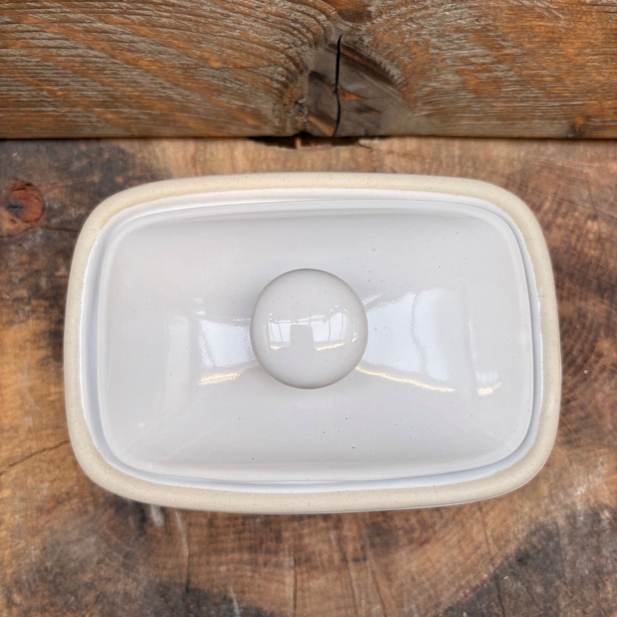 A lidded Butter Dish glazed in our Studio White with a natural clay element.